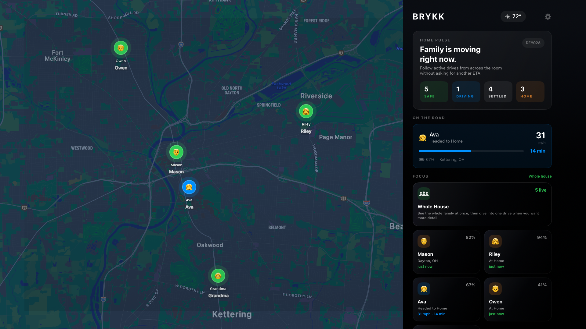BRYKK understands when someone is driving, heading your way, arriving home, losing signal, or needs help. It is built to feel calm when nothing is wrong and immediate when something is.
