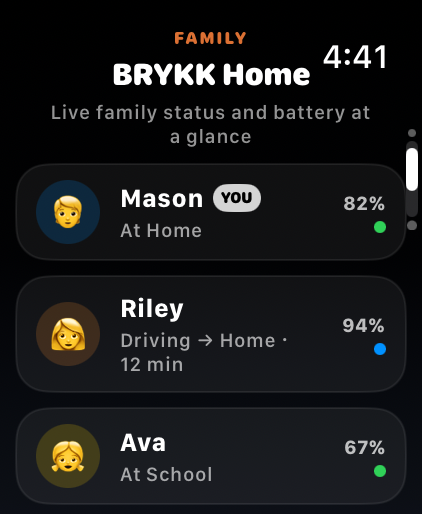 Open BRYKK on your wrist and verify you can see family status and emergency entry points.